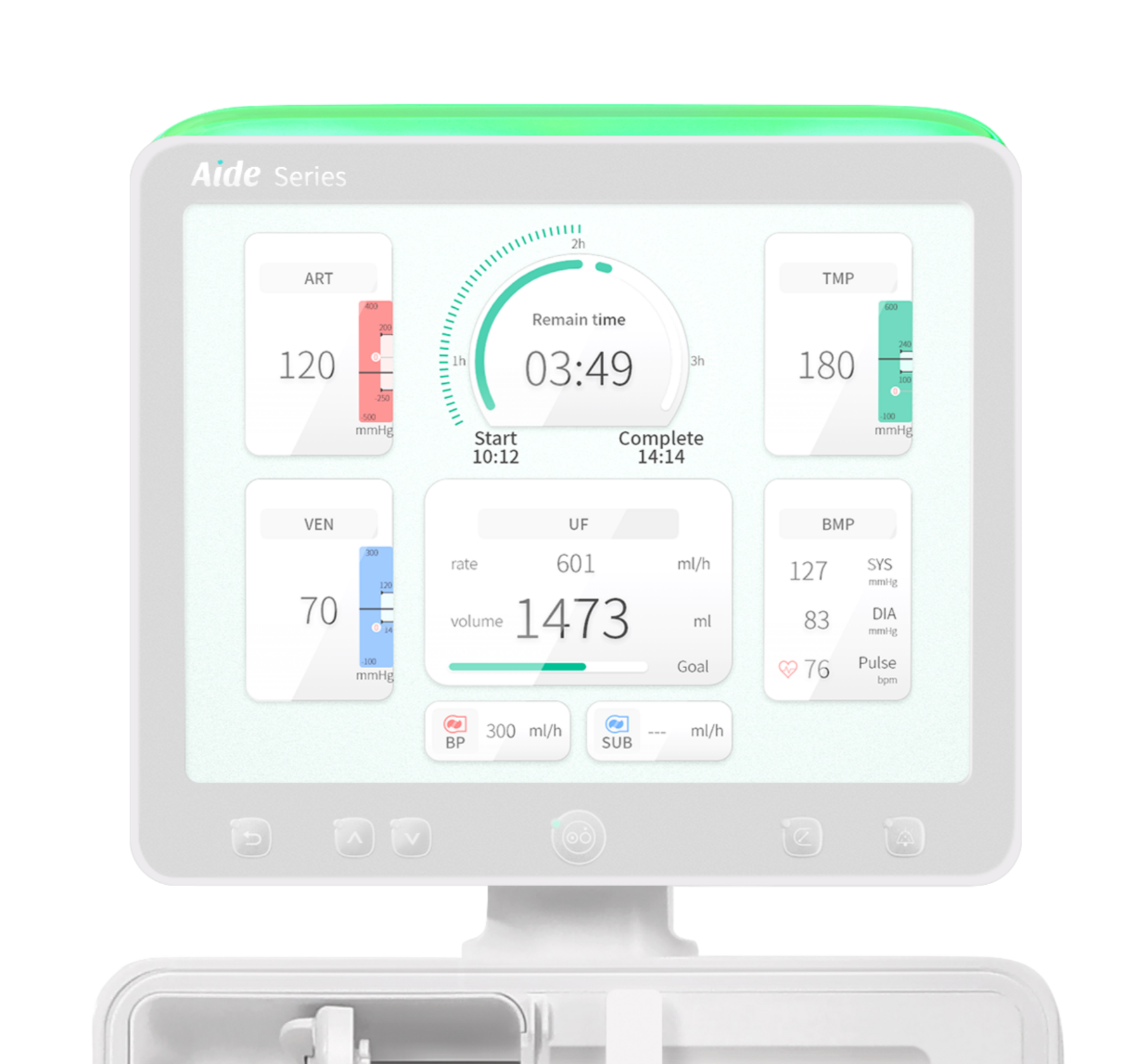 The Aide1 series hemodialysis equipment is dedicated to providing reliable support for patients' hemodialysis treatments and enhancing clinical operational experience through personalized settings. The product adopts a modular distributed design, featuring functions such as online priming, one-key draining, online blood pressure monitoring, and central control braking.